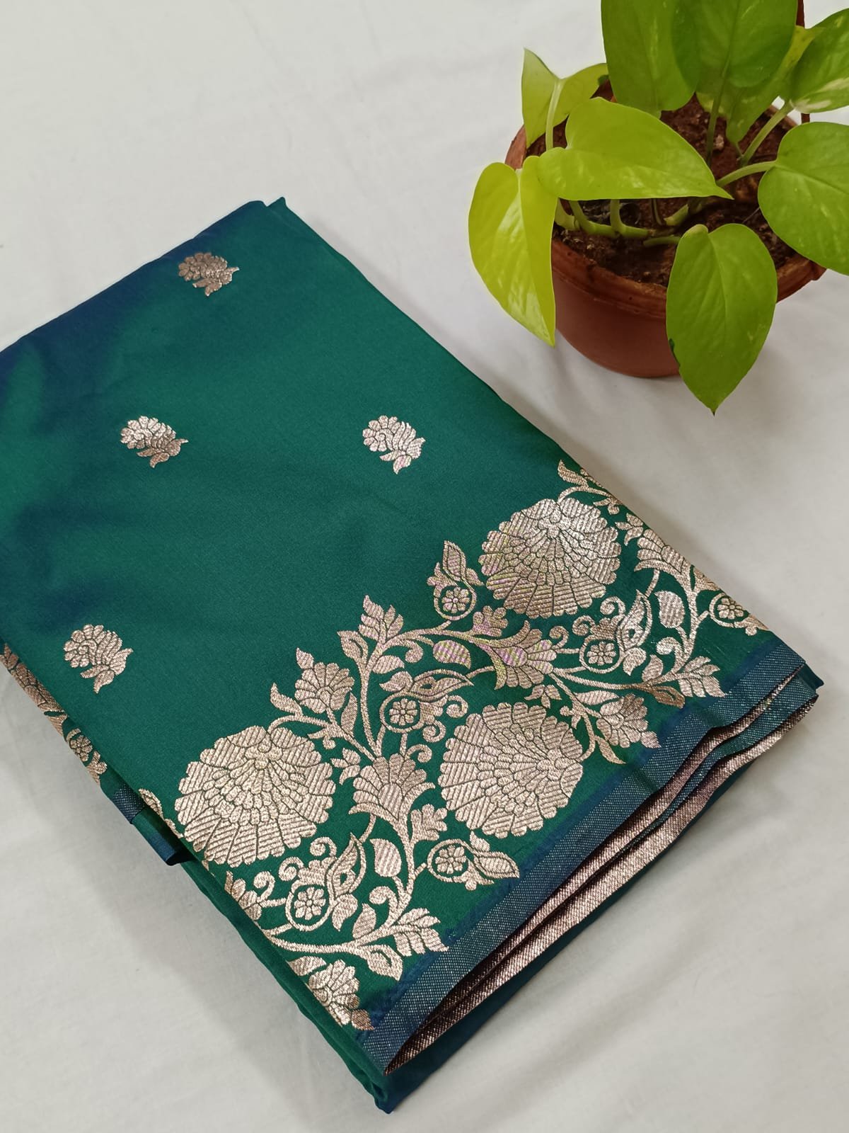 This elegant Soft Katan Silk Saree features a rich dual-tone peacock green and royal blue base enhanced with delicate woven motifs for a classy traditional look. The smooth katan silk texture gives a graceful drape with a subtle sheen, making it ideal for festive occasions, functions, and elegant day wear. Comes with a matching blouse piece to complete the look beautifully.